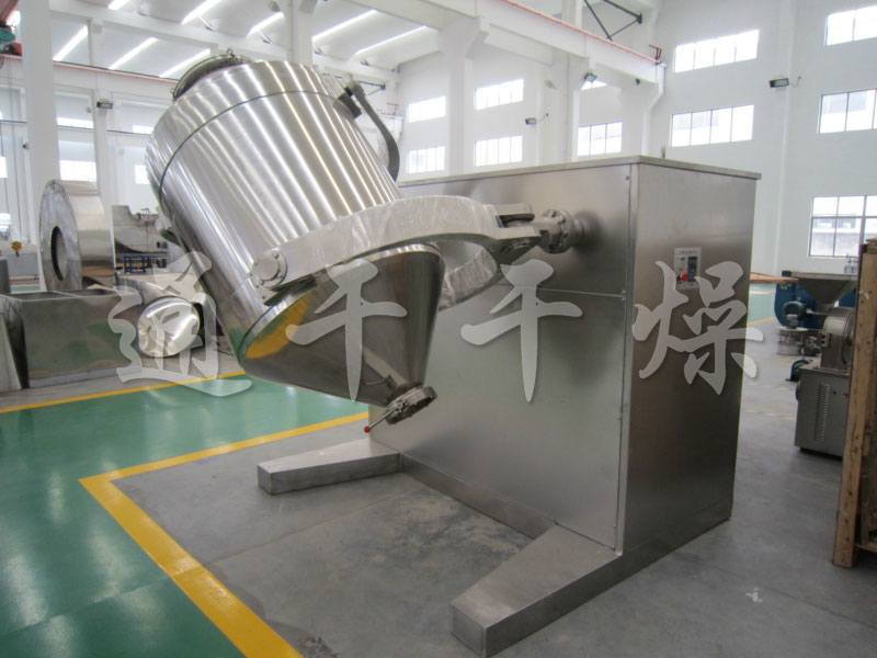 結構:該機由機座、傳動系統、電器控制系統、多向運動機構、混合筒等部件組成。與物料直接接觸的混合筒采用優質不銹鋼材料制造,桶體內外壁均經鏡面拋光。